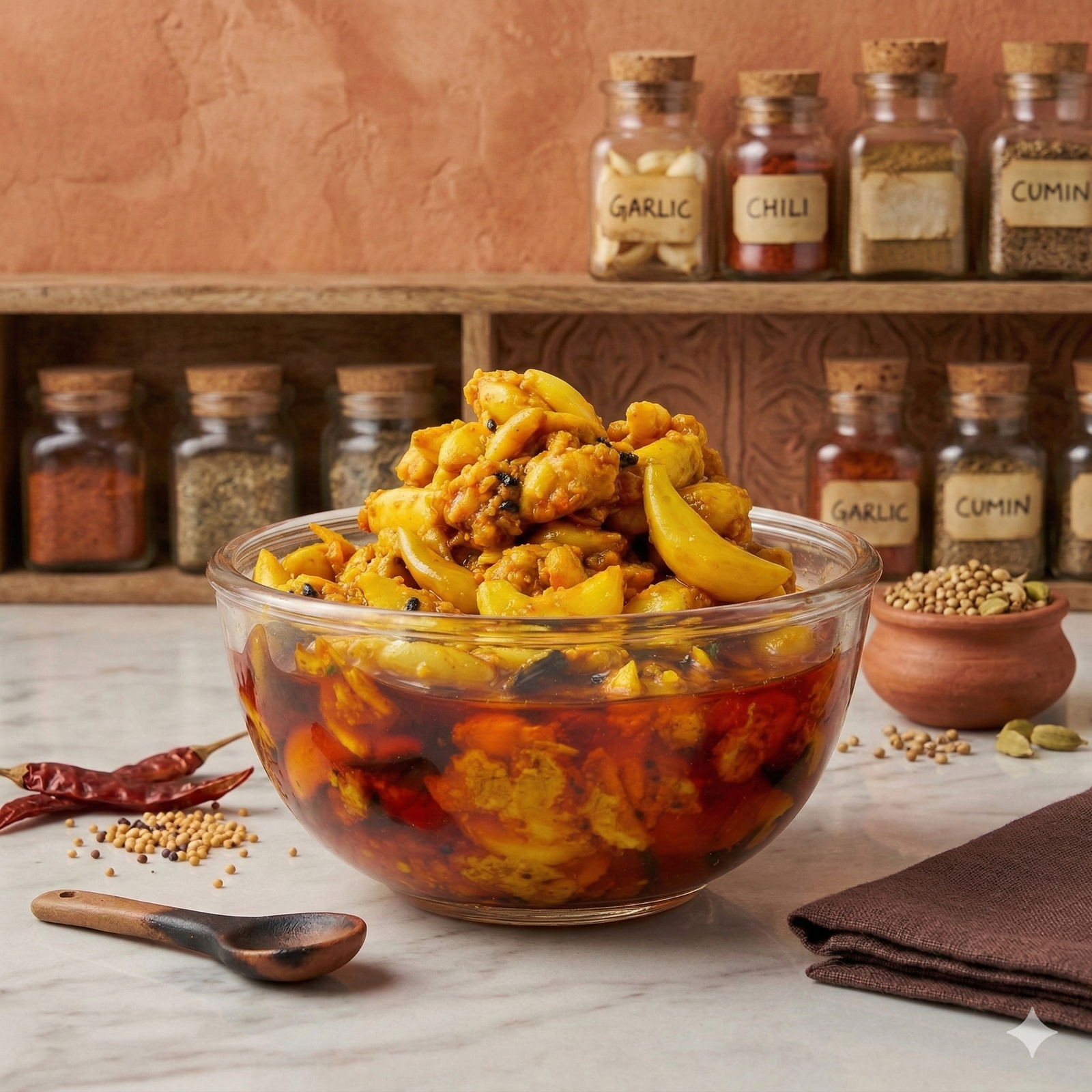 Unleash the bold flavors of our Homemade Garlic Pickle, a pungent delight that adds zest to any meal. This artisanal pickle showcases the robust taste of fresh garlic, carefully preserved to maintain its potent aroma and health benefits.