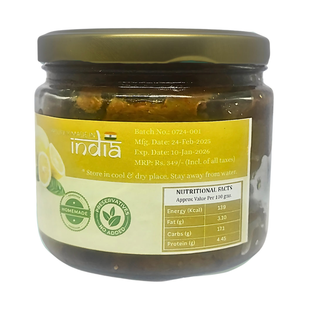 Completely free from preservatives, artificial colors, or additives, our lemon pickle is handcrafted in small batches to ensure authentic flavor and superior quality. Each jar is a perfect balance of sourness, spice, and natural fermentation—a delicious and healthy condiment for your everyday meals.
